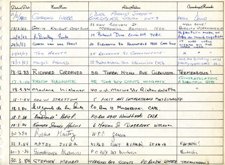 Gilwell Log Books 1st Gillwell Logbook 1926-1955 1 Image 1 of 221 Black Album 1958-1960 Page-27-Small Image 1 of 36 Boy Scouts of SA 56-64 Page-52-Small Image 1 of 84 Boy Scouts of SA 68-75 Page-56-Small Image 1 of 88 Boy Scouts of SA 76-81 Page-56-Small Image 1 of 91 Boy Scouts of SA 81-89 Cover-Page Image 1 of 153 Boy Scouts of SA 1989-1992 Page-50-Small Image 1 of 81 Gilwell – 4th Benoni 1920-1954 Page-26-Small Image 1 of 34 Miss Gladys Gunning – 1923-1936 Page-13-Small Image 1 of 26 Up to June 2012 IMG_0124 Image 1 of 105 Visitors’ Book Cover-Page Image 1 of 186 BP Coach Restoration Album Page-22-Medium Image 22 of 26